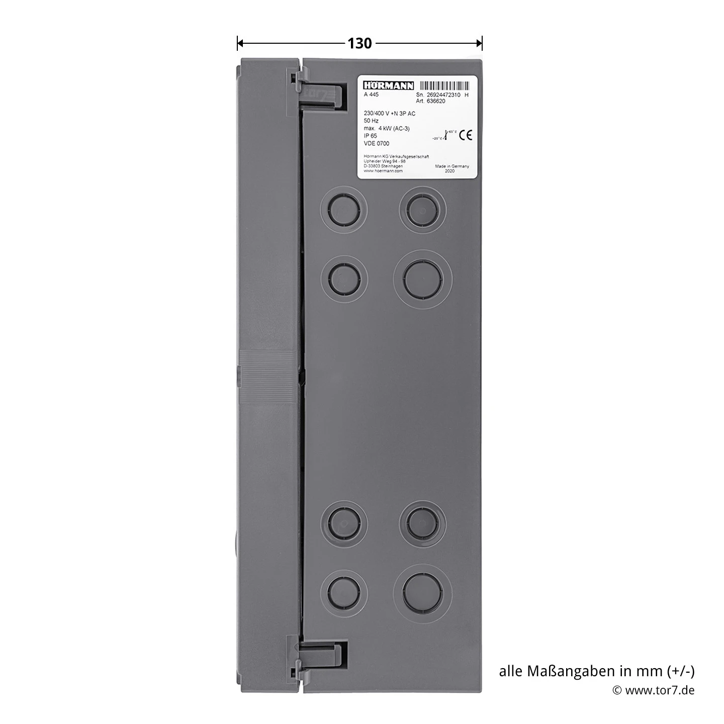 Die Hörmann Steuerung A 445 ist eine Mikroprozessorsteuerung in einem robustem, IP65-geschütztem Kunststoffgehäuse mit integriertem Folientaster für die Impuls-Funktionen Auf-Halt-Zu und eingebautem Miniaturschloss zur Sperrung von externen Bedienelementen. Geeignet ist diese intelligente und verlässliche Torsteuerung für Industrie-Antriebe, wie dem Hörmann Wellenantrieb WA 400 oder dem Hörmann Kettenantrieb ITO 400. Die Montage erfolgt dabei in unmittelbarer Tornähe, wobei die Einstellarbeiten bequem direkt von der Steuerung vorgenommen werden können. Die 2-fache 7-Segment-Anzeige lässt sich besonders gut ablesen und erleichtert die Arbeit an der Steuerung zusätzlich. Die Auslieferung erfolgt einbaufertig inklusive Zubehörbeutel, jedoch ohne Netzanschlusskabel.