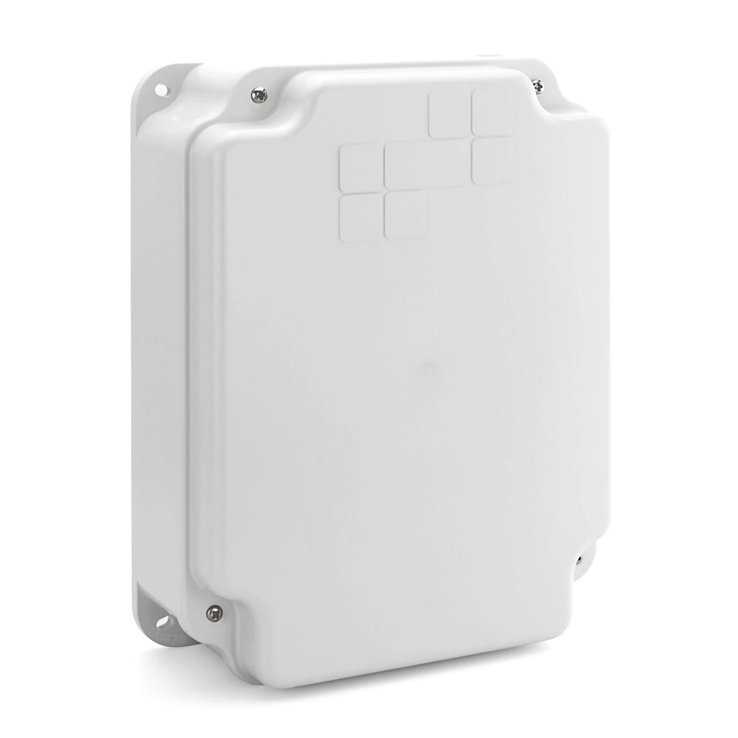 Dank dieses Steuerungsgehäuses ist es u. a. möglich, die Steuerung in einer optimaler Arbeitshöhe in der Nähe des Torantriebs anzubringen. Zudem lässt sich die Platine dank der im Gehäuseunterteil vorhandenen Verschraubungen optimal an einer Wand befestigen. Nach unten hin gibt es drei verschraubbare Kabeleingänge, die für die Leitungen zur Stromversorgung, zum Antriebsmotor und für Zubehör vorgesehen sind. Der zugehörige Deckel mit der innen liegenden Gummidichtung schließt das Gehäuse so weit ab, dass kaum noch Feuchtigkeit eindringen kann. Das verschlossene Gehäuse entspricht somit der Schutzart IP 44. Um das Eindringen größerer Mengen an Wasser zu verhindern, wird zudem empfohlen, den Deckel niemals bei feuchter Witterung zu öffnen.