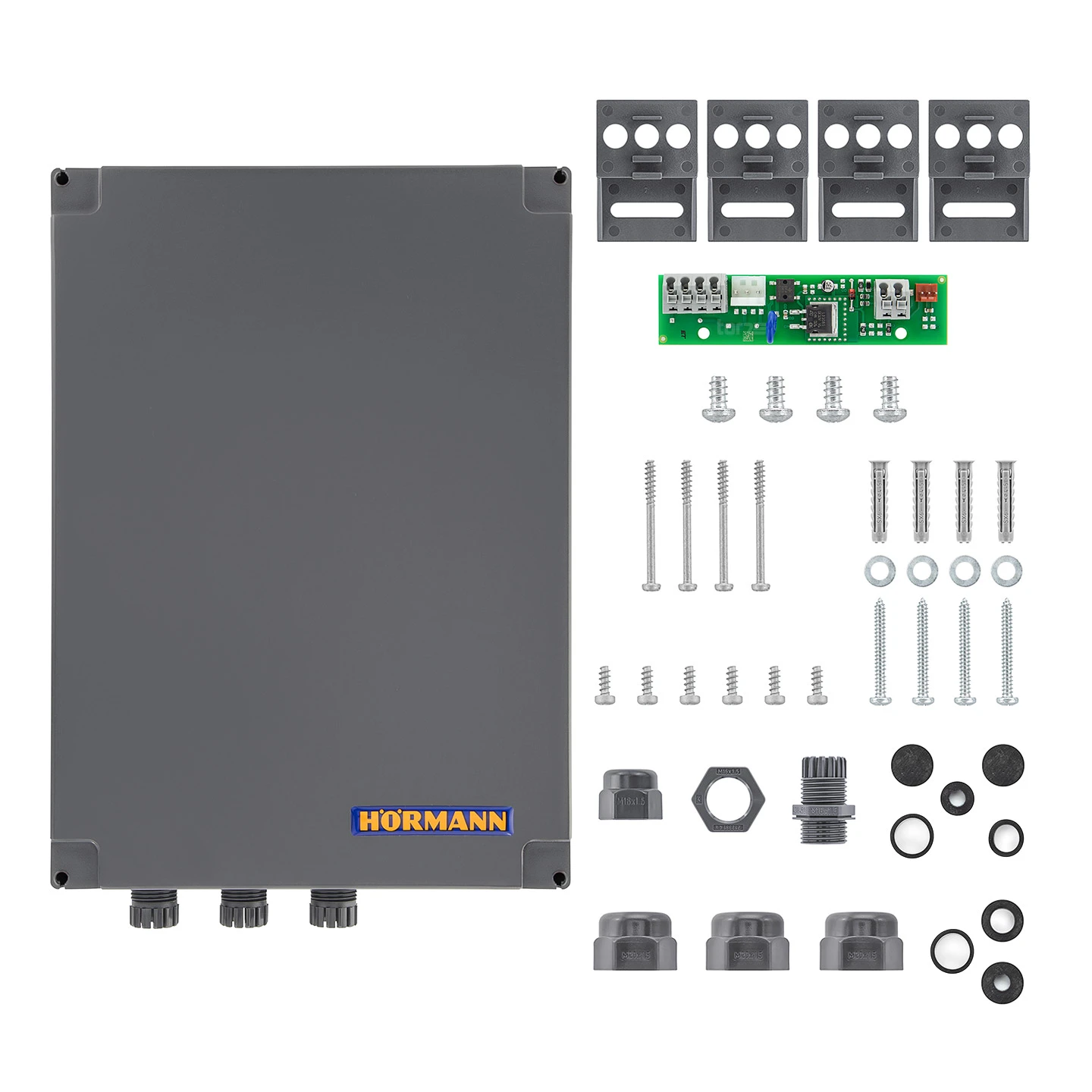 Hinweis: Die Teile des im Hörmann Umrüstsatz auf externe Steuerung VersaMatic beiliegenden Steuerungsgehäuses sind auch einzeln erhältlich. Sie sind dabei für alle RotaMatic und VersaMatic Drehtorantriebe geeignet. Der Umrüstsatz beinhaltet neben dem Gehäuse nur eine Anschlussplatine für die Motoreinheit. Es ist also keine Steuerplatine enthalten. Diese wird separat als Hörmann Steuerungsplatine RotaMatic VersaMatic mit BiSecur-Empfänger angeboten.